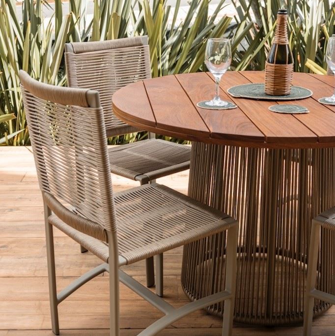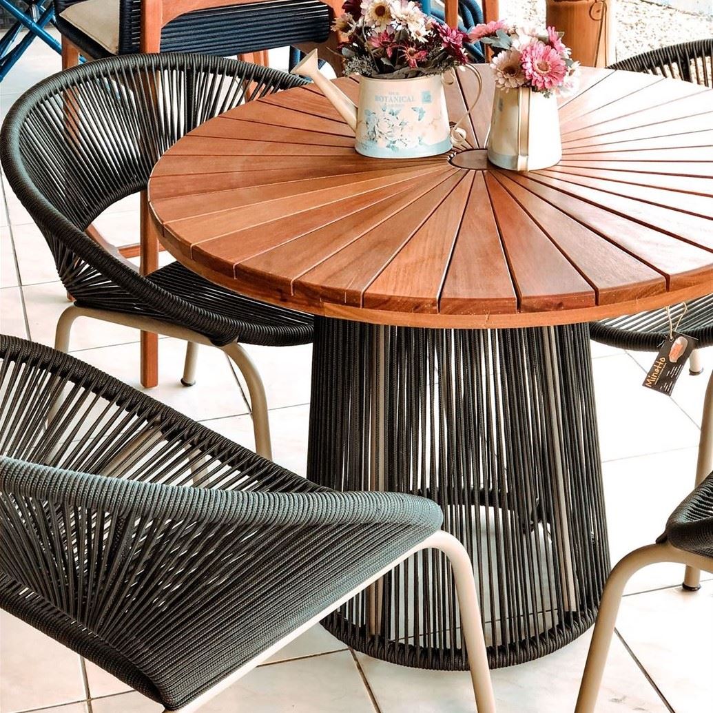Estrutura: Alumínio, Tampo em madeira Cumaru