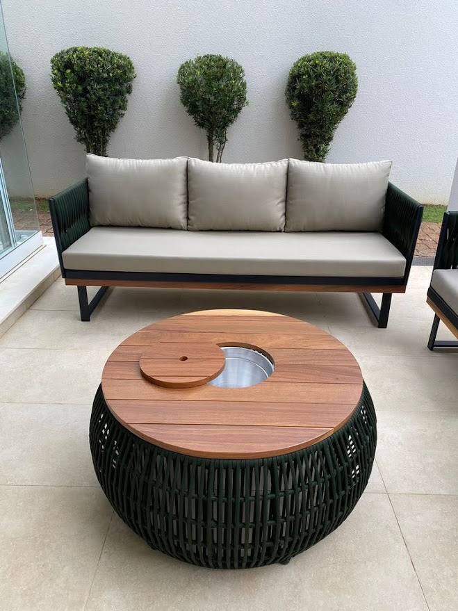 Estrutura: Alumínio, Tampo em madeira Cumaru